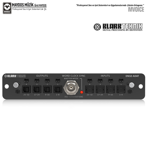 DN32-ADAT kartı, MIDAS M32 veya BEHRINGER X32 dijital mixer konsolunuzu herhangi bir ADAT I / O uyumlu cihaza sorunsuz bir şekilde entegre etmenizi sağlar. Buna bağımsız kayıt cihazları, dijital ses iş istasyonları veya benzer şekilde donatılmış diğer dijital mixerler ve sinyal işlemcileri dahildir.